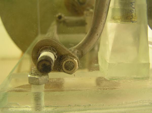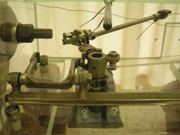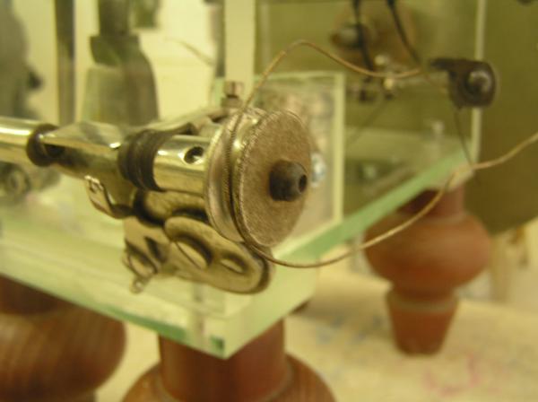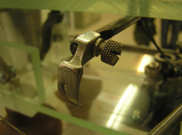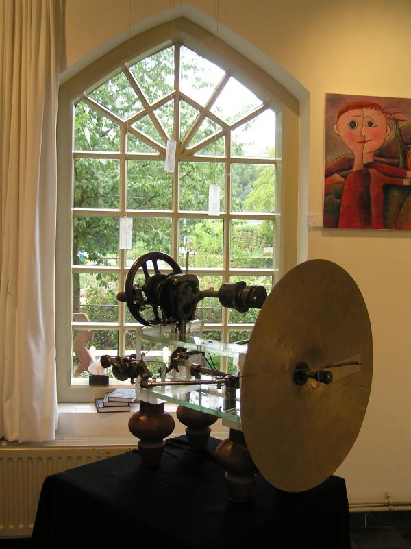 Materiaal: plexiglas, metalen delen van een oude handnaaimachine, bekken, gitaarsnaar, houten poten van een bank.