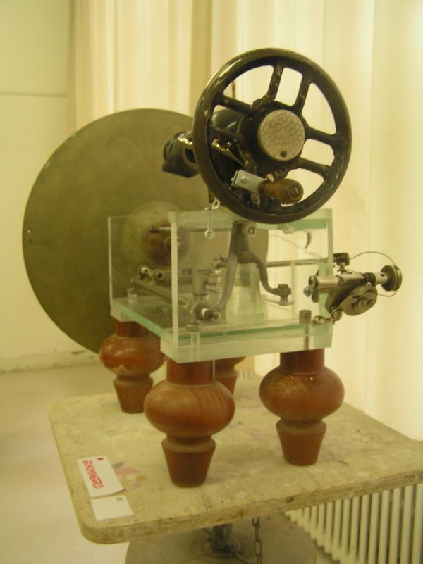 Materiaal: plexiglas, metalen delen van een oude handnaaimachine, bekken, gitaarsnaar, houten poten van een bank.